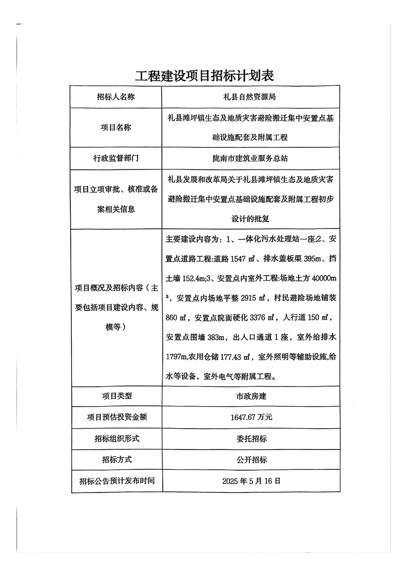 禮縣灘坪鎮(zhèn)生態(tài)及地質(zhì)災(zāi)害避險搬遷集中安置點(diǎn)基礎(chǔ)設(shè)施配套及附屬工程