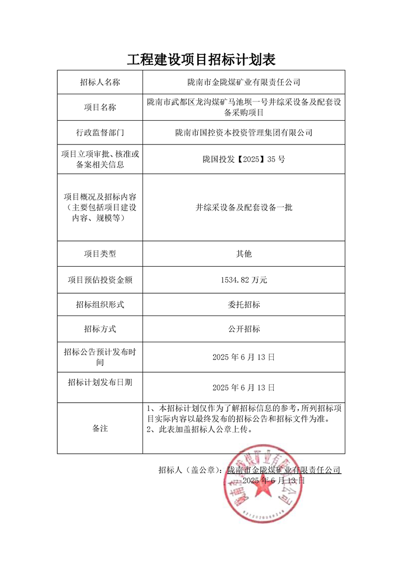 隴南市武都區(qū)龍溝煤礦馬池壩一號(hào)井綜采設(shè)備及配套設(shè)備采購(gòu)項(xiàng)目