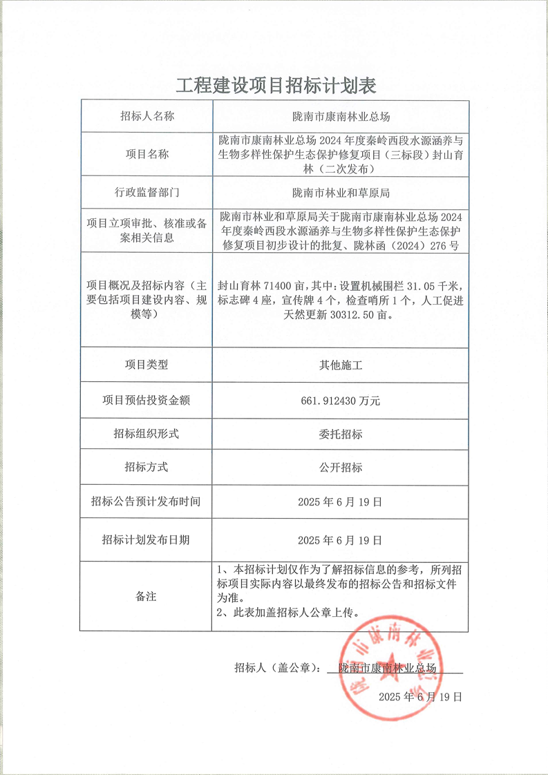 隴南市康南林業(yè)總場2024年度秦嶺西段水源涵養(yǎng)與生物多樣性保護生態(tài)保護修復(fù)項目(三標(biāo)段)封山育林(二次發(fā)布)