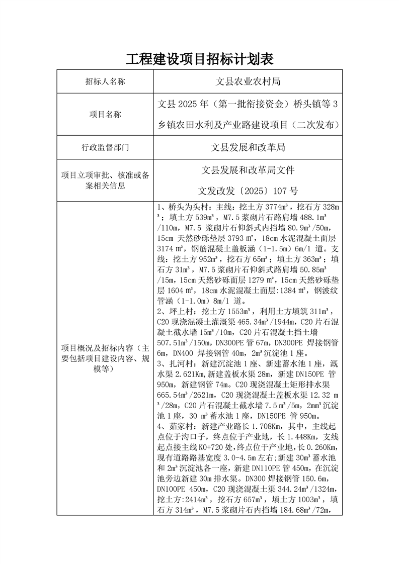 文縣2025年(第一批銜接資金)橋頭鎮(zhèn)等3鄉(xiāng)鎮(zhèn)農田水利及產業(yè)路建設項目(二次發(fā)布)