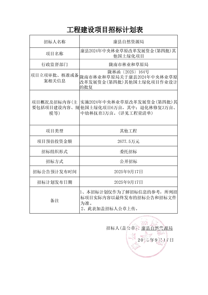康縣2024 年中央林業(yè)草原改革發(fā)展資金(第四批)其他國土綠化項目