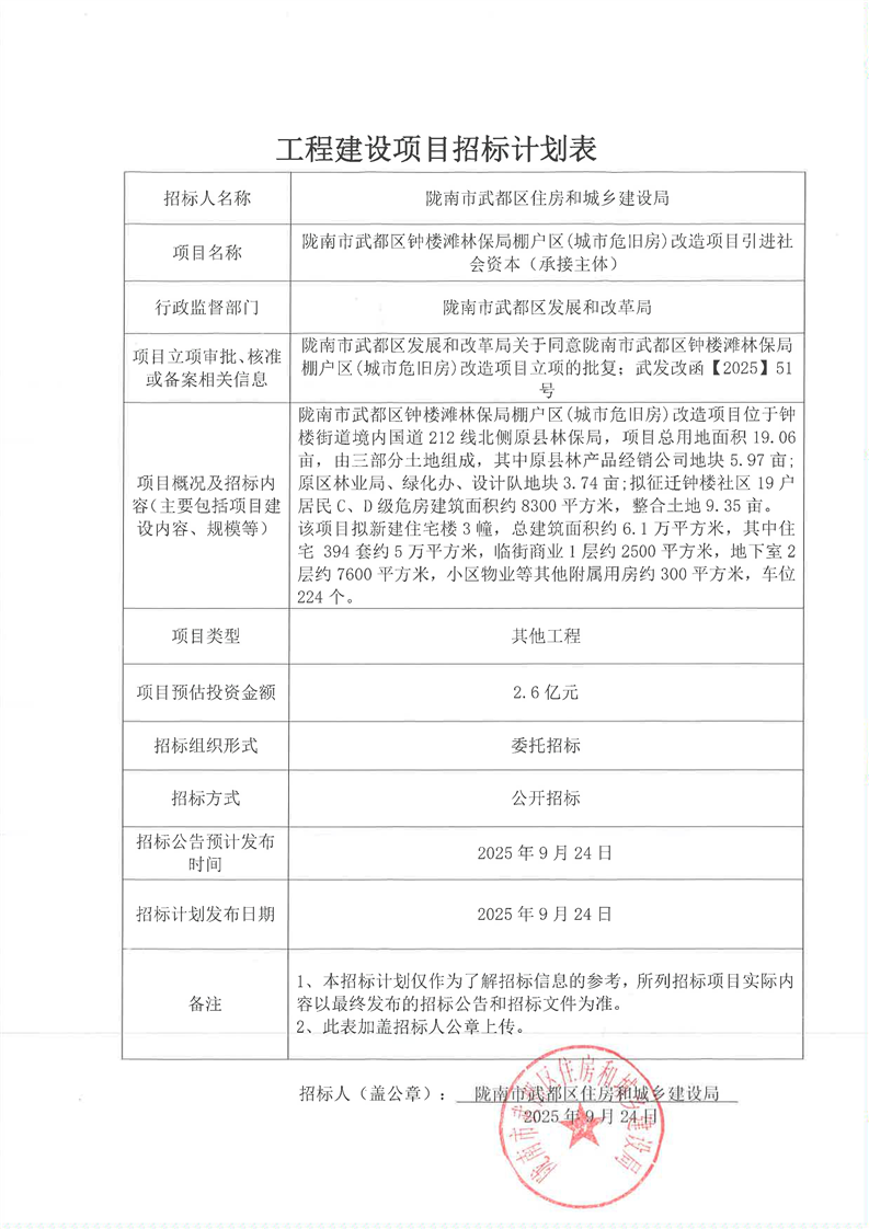 隴南市武都區(qū)鐘樓灘林保局棚戶區(qū)(城市危舊房)改造項目引進(jìn)社會資本(承接主體)