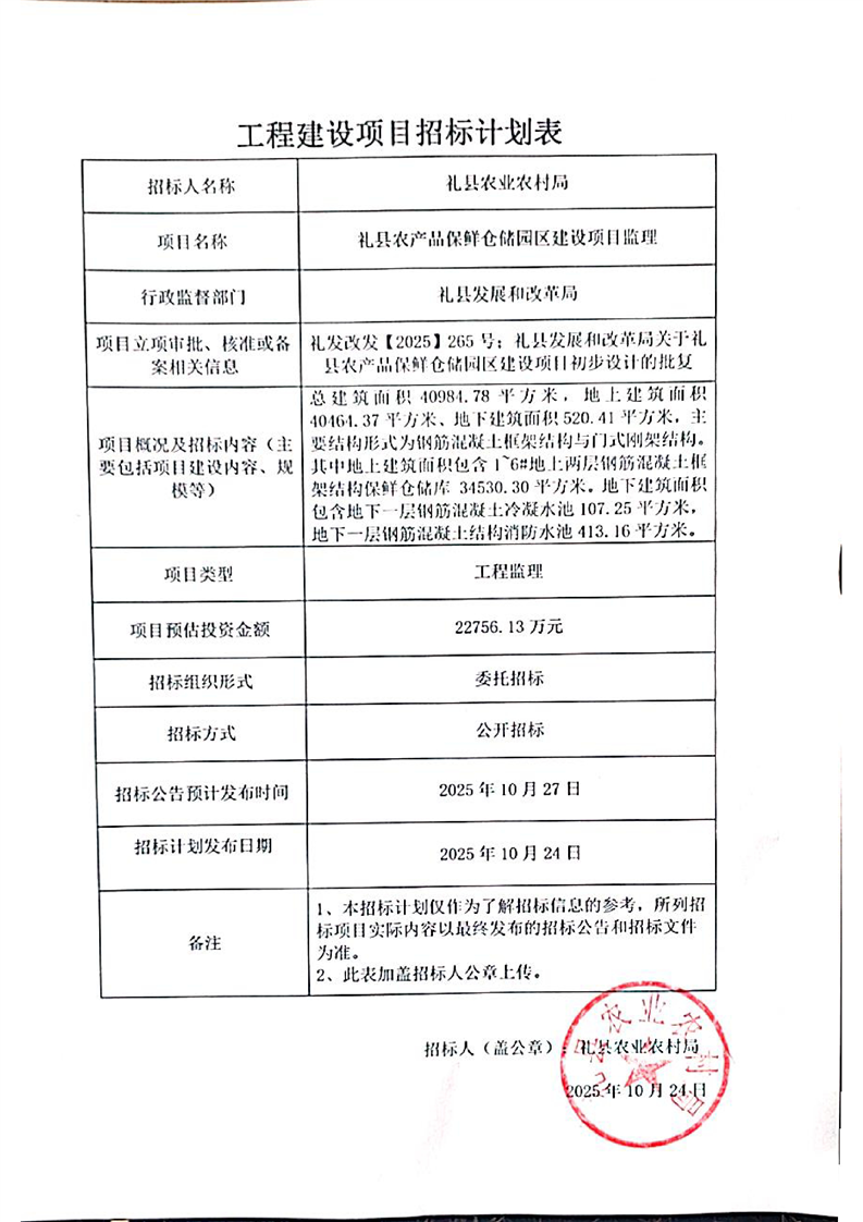 禮縣農(nóng)產(chǎn)品保鮮倉儲園區(qū)建設項目監(jiān)理