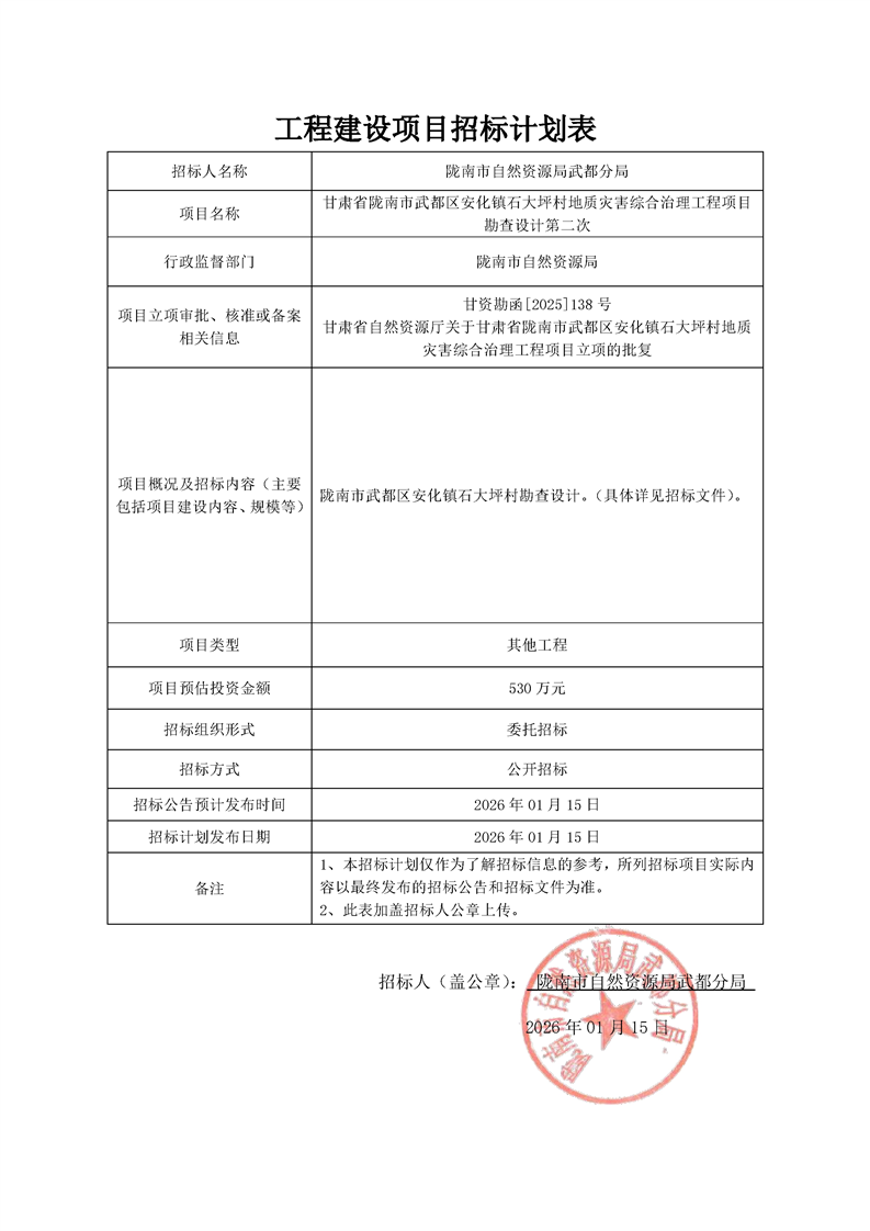 甘肅省隴南市武都區(qū)安化鎮(zhèn)石大坪村地質(zhì)災害綜合治理工程項目勘查設計第二次