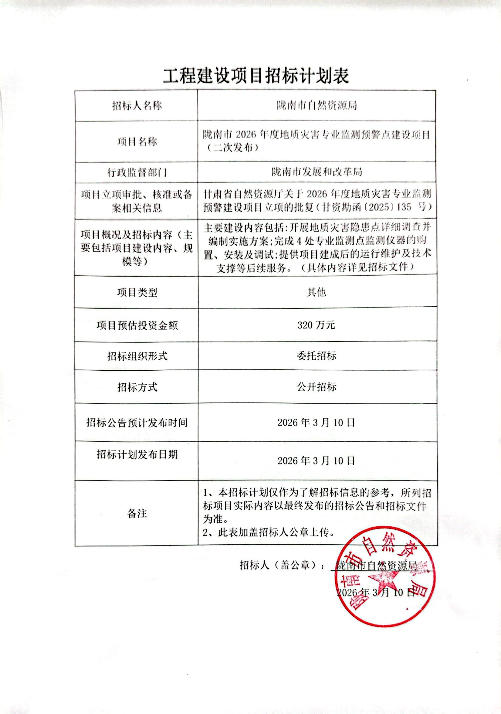 隴南市2026年度地質(zhì)災害專業(yè)監(jiān)測預警點建設項目(二次發(fā)布)