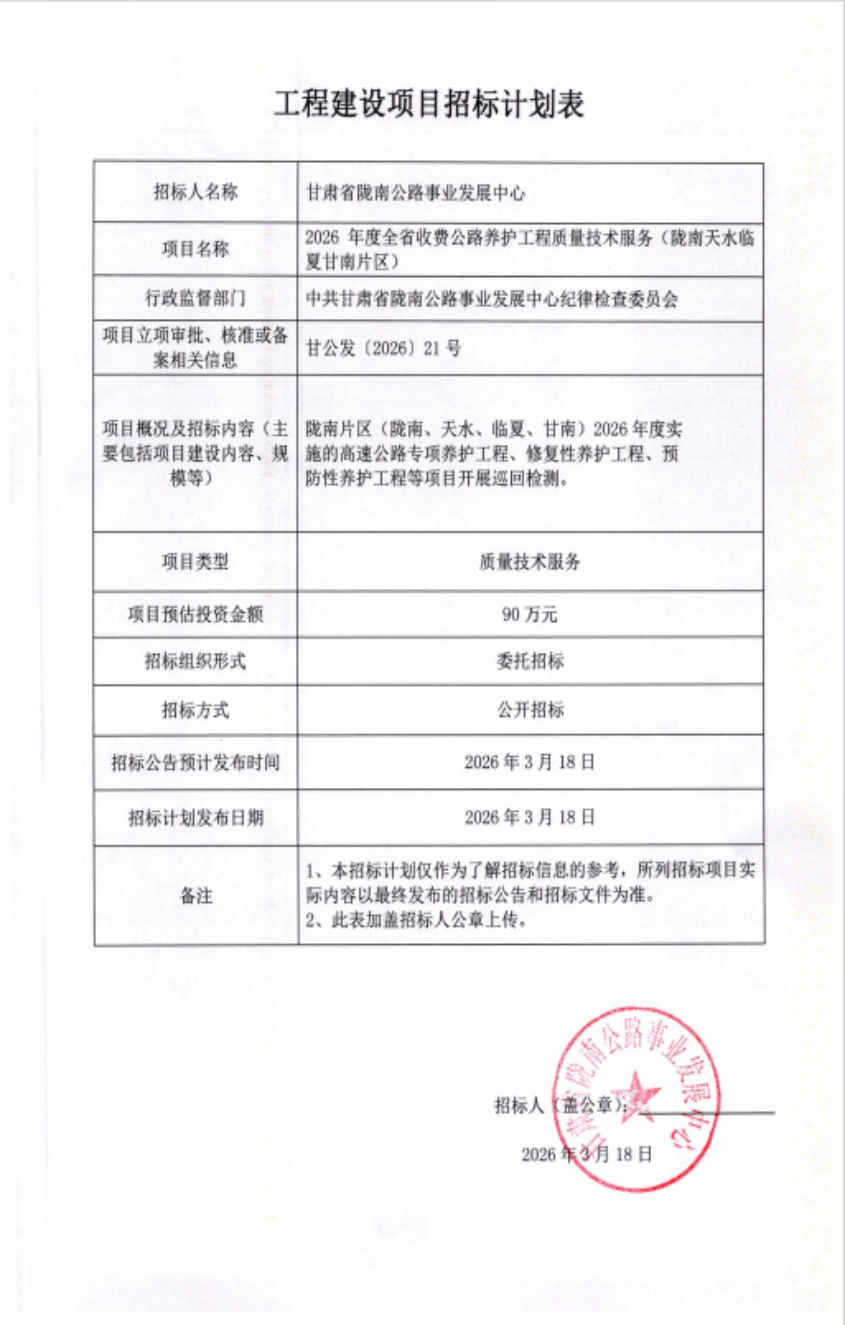 2026年度全省收費(fèi)公路養(yǎng)護(hù)工程質(zhì)量技術(shù)服務(wù)(隴南天水臨夏甘南片區(qū))