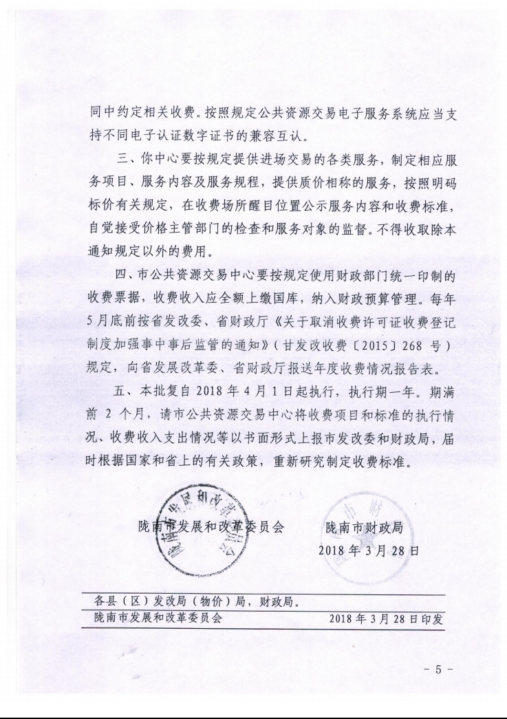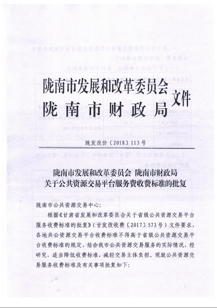 隴南市發(fā)展和改革委員會 隴南市財政局關于公共資源交易平臺服務費收費標準的批復